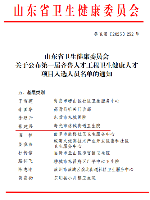 寿光融媒讯 近日,山东省卫生健康委员会正式公布第一届齐鲁人才工程卫生健康人才项目入选人员名单,潍坊寿光市洛城街道卫生院党支部书记、院长张建兵凭借深厚的专业素养、突出的工作业绩成功入选,成为全省基层类别10名优秀卫生健康工作者之一。