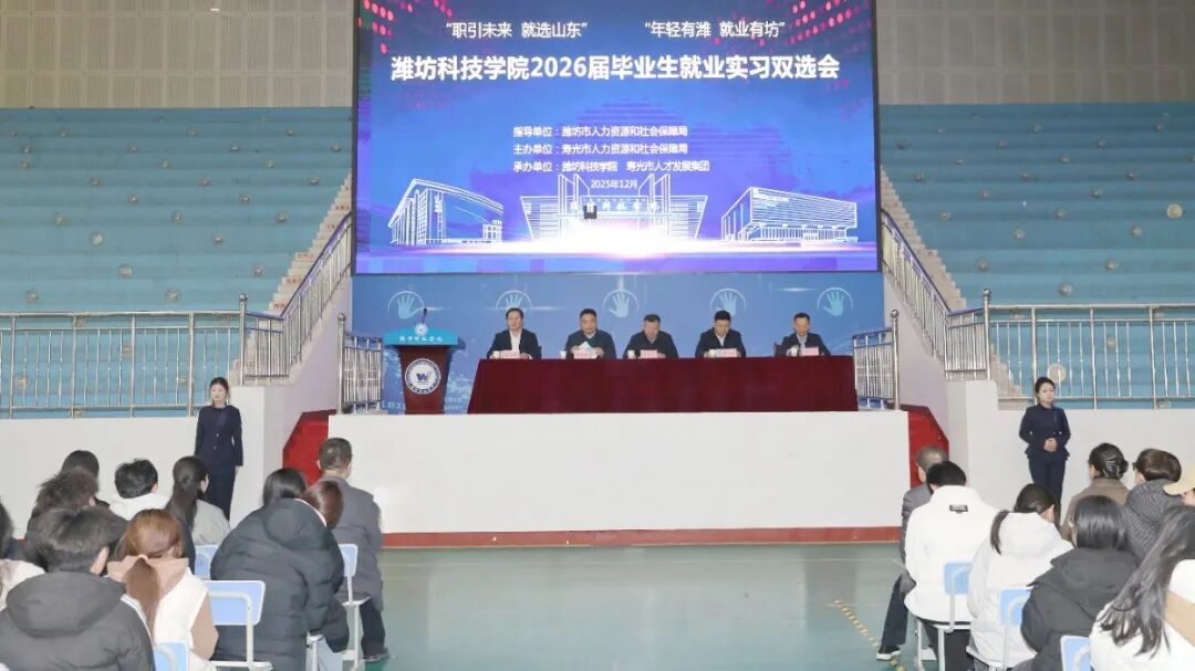寿光融媒讯 12月6日,潍坊科技学院2026届毕业生就业实习双选会在体育馆举办。潍坊市公共就业和人才服务中心党委委员、副主任秦志伟,寿光市政协党组成员,潍坊科技学院党委副书记、校长付乐启,寿光市公共就业和人力资源服务中心主任郑文波,寿光市人才发展集团董事长刘子兴参加开幕式。潍坊科技学院党委委员、副校长徐友信主持。