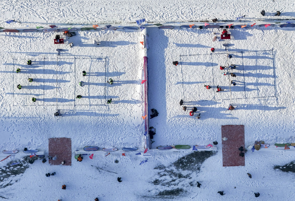 2025年12月25日,人们在第八届哈尔滨松花江冰雪嘉年华园区内体验冰上排球(无人机照片)。本届冰雪嘉年华推出近60项特色项目,为市民与游客打造多样化的冰雪体验。