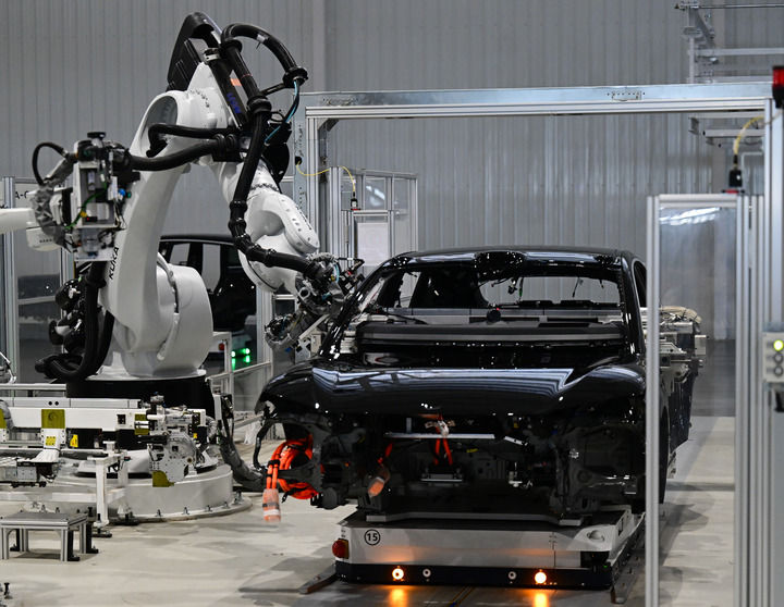 2025年7月1日在合肥市新桥智能电动汽车产业园蔚来第二工厂拍摄的新能源汽车生产线。新华社记者 周牧 摄